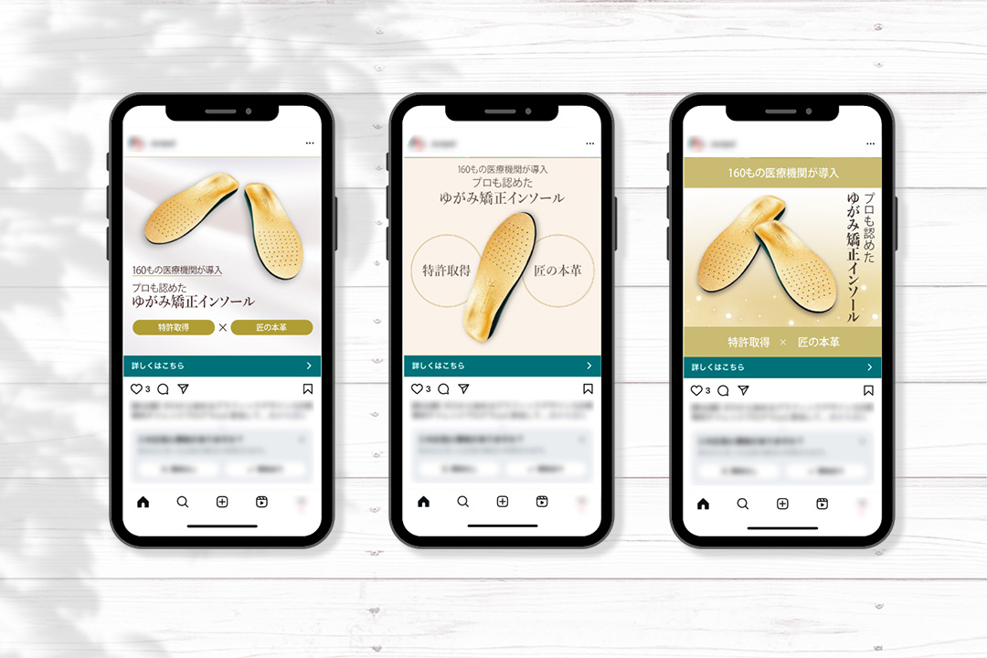 物販バナー 2025年11月17日 最終更新日時 : 2025年11月17日 JJ Design ◼️制作物:バナー ◼️ターゲット:老若男女、O脚・X脚・猫背・外反母趾などで悩んでいる人向け ◼️サイズ:1080px × 1080px ◼️用途:Facebook、Instagramの広告などで使用 ◼️制作ポイント:商品画像の見え方を3パターン全て変え、商品の魅力がより引き立つよにデザインに。 \ 最新情報をチェック /